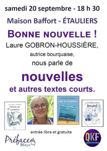Dans le cadre des rencontre littéraires à la Maison Baffort d’Étauliers, Préface (association organisatrice de Livres en citadelle les 13 et 14 décembre) en partenariat avec la Fédération QKF (QUESKONFABRIK ?) organise un moment d’échanges avec l’autrice nouvelliste Laure GOBRON-HOUSSIÈRE.